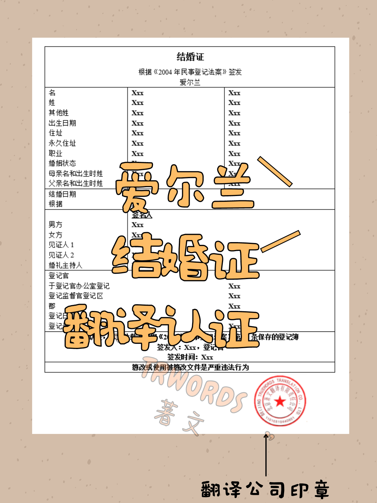 爱尔兰结婚证翻译认证翻译盖章样例 Post author:new_ecyti Post published:2024-04-28 Post category:著文之声 结婚证是由婚姻登记部门签发的证明婚姻关系的文件。在申请移民、… 继续阅读爱尔兰结婚证翻译认证翻译盖章样例