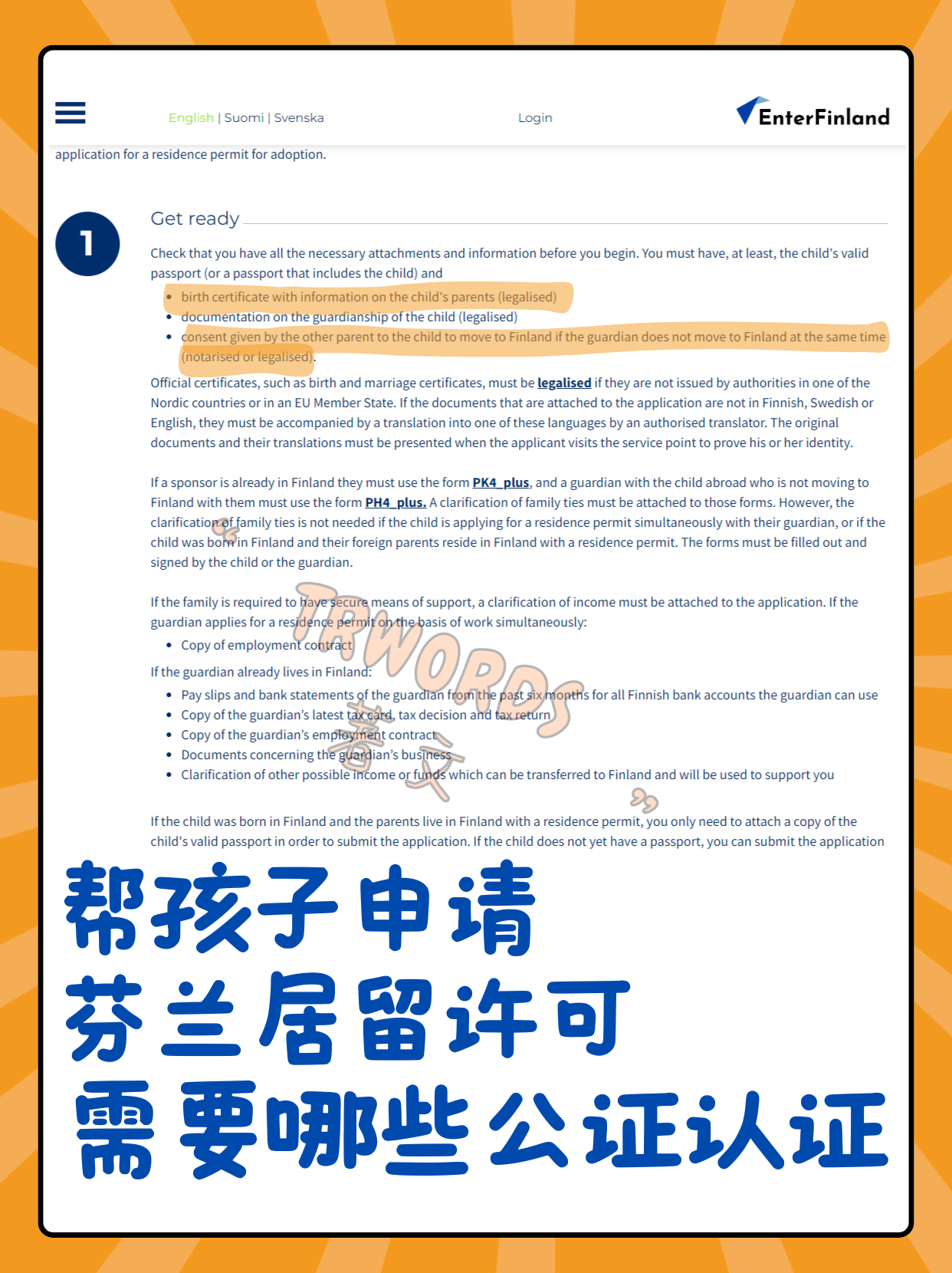 帮孩子申请芬兰居留许可需要做哪些公证认证 Post author:new_ecyti Post published:2024-08-19 Post category:著文之声 芬兰移民局官网显示,父母一方是芬兰公民或有芬兰居留许可,帮未… 继续阅读帮孩子申请芬兰居留许可需要做哪些公证认证