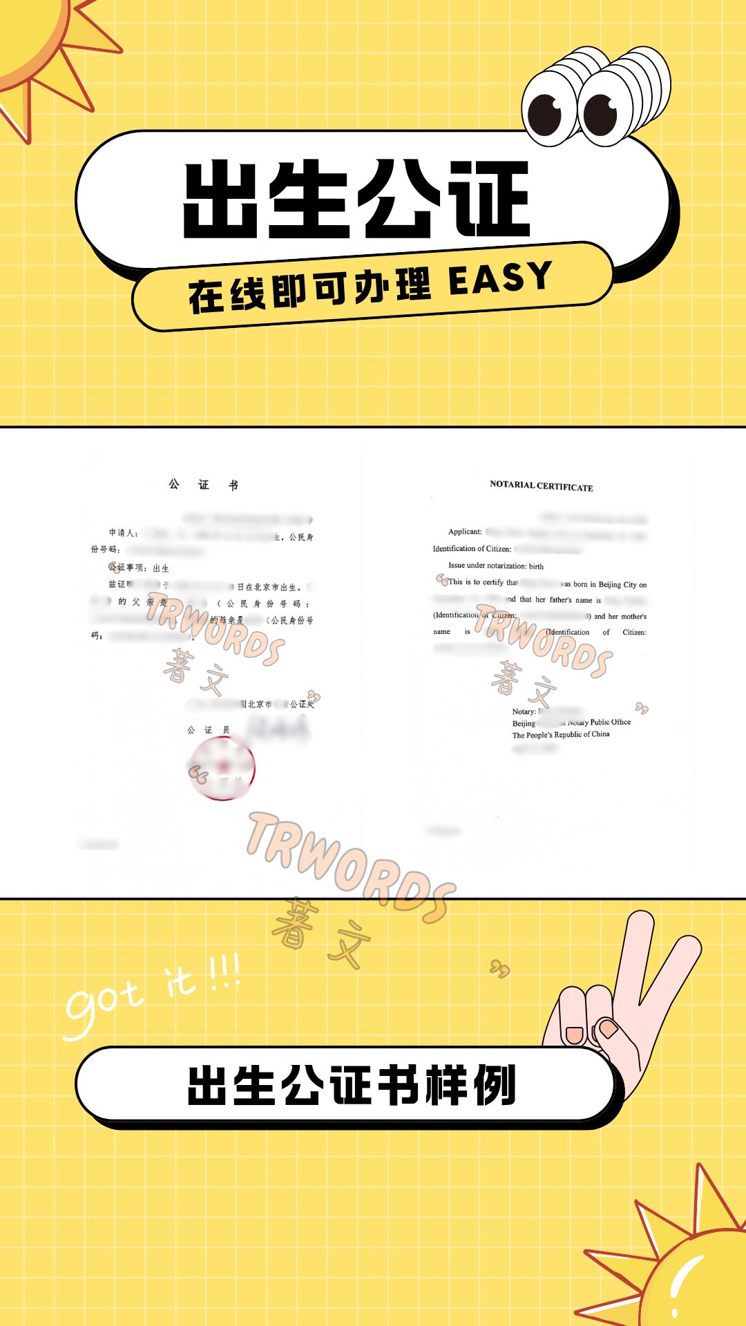 - • 出具中英双语的双号出生公证书