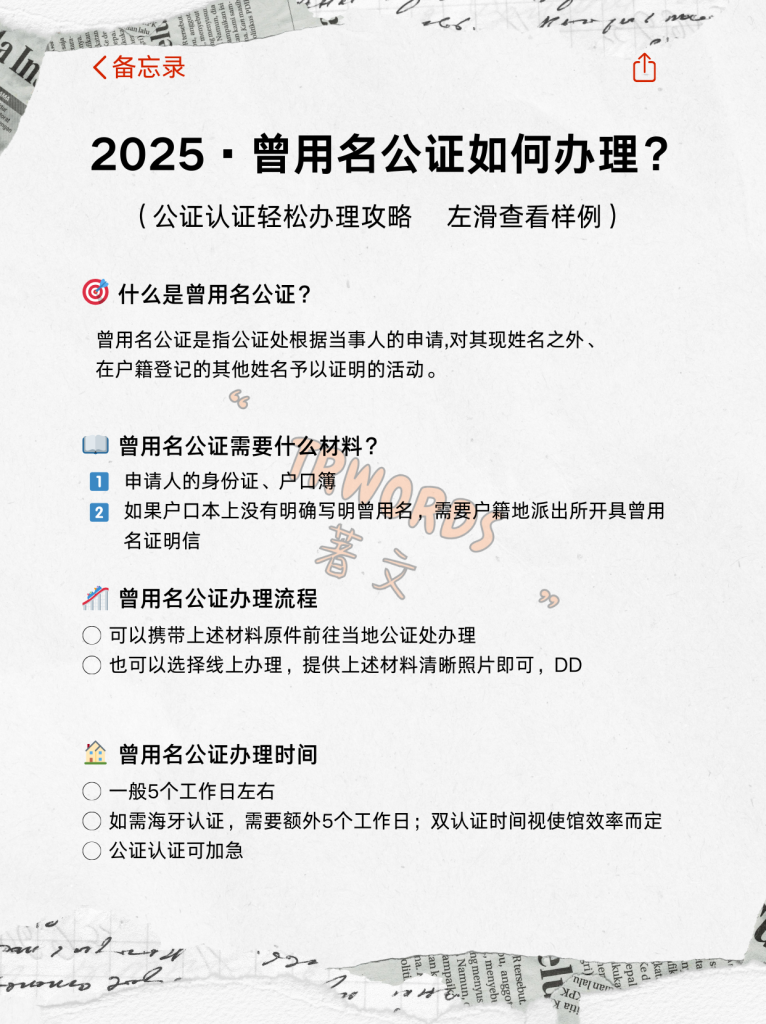 有的人可能使用过不止一个名字,此前用过的名字就被叫作“曾用名”。在国内买房、贷款等事宜时,在国外留学、移居时,有过曾用名的人们有时需要办理曾用名公证。
